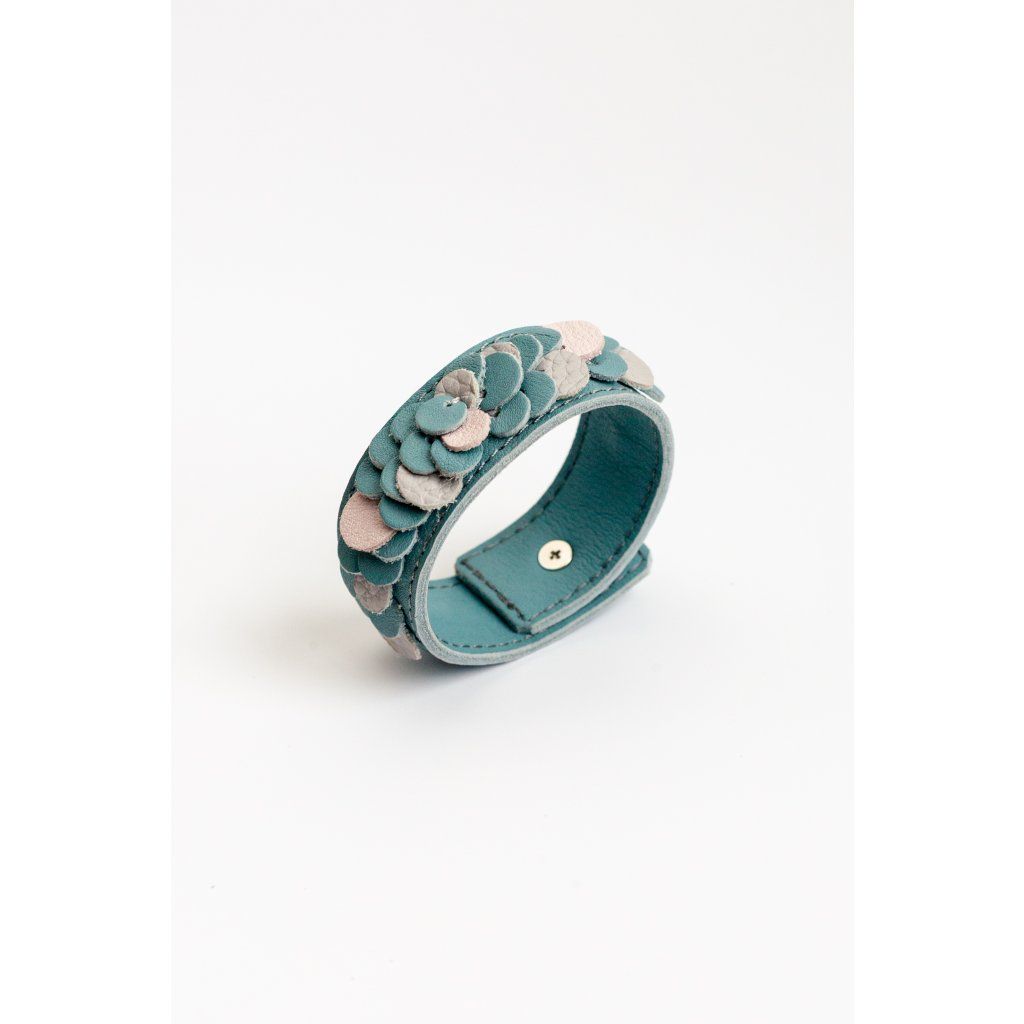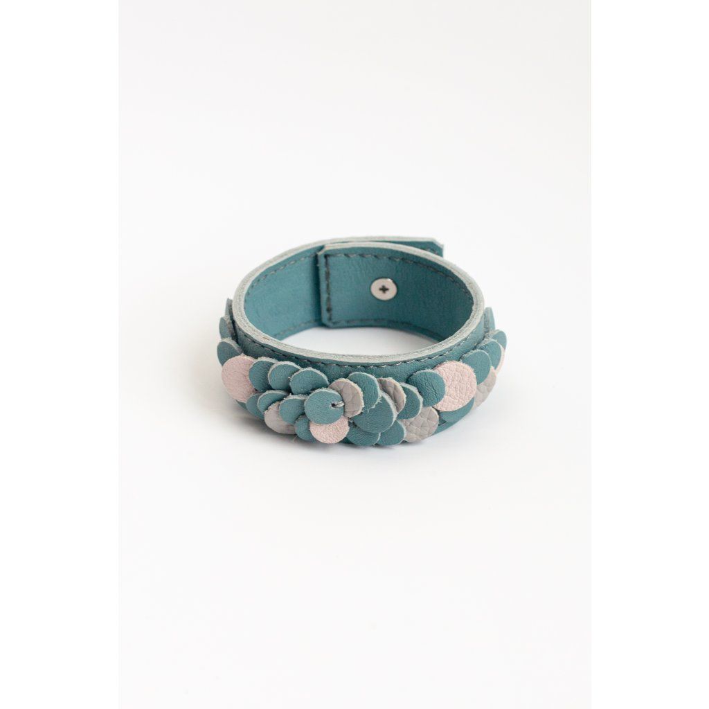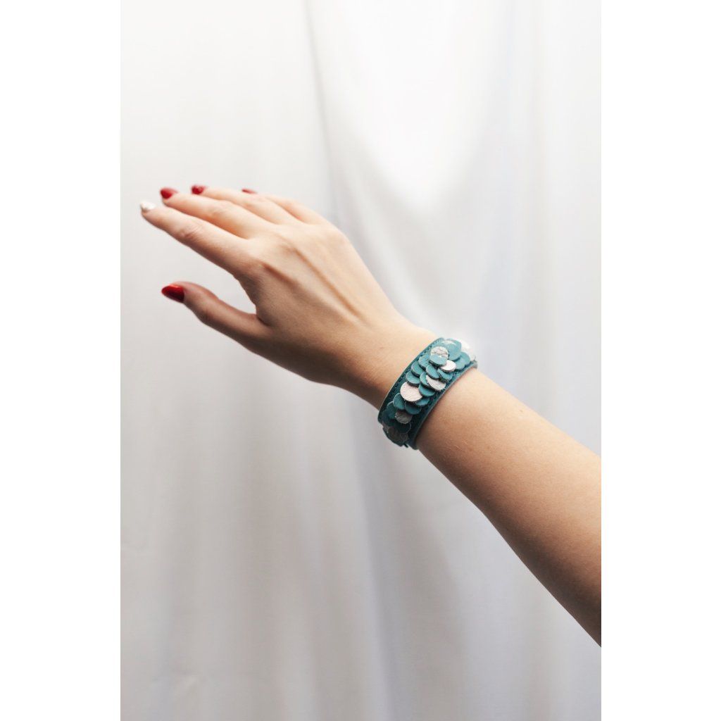 Stylový kožený náramek s originálním dekorem z kolekce Metráž BEAU. Při výrobě tohoto šperku bylo užito procesu tzv. upcyklace. Náramek je vyrobený ze zbytků kvalitních kůží z dílen českých designérů. METRÁŽE BEAU je řada designovaná přímo v naší dílně, tyto produkty tvoří základ našeho sortimentu.